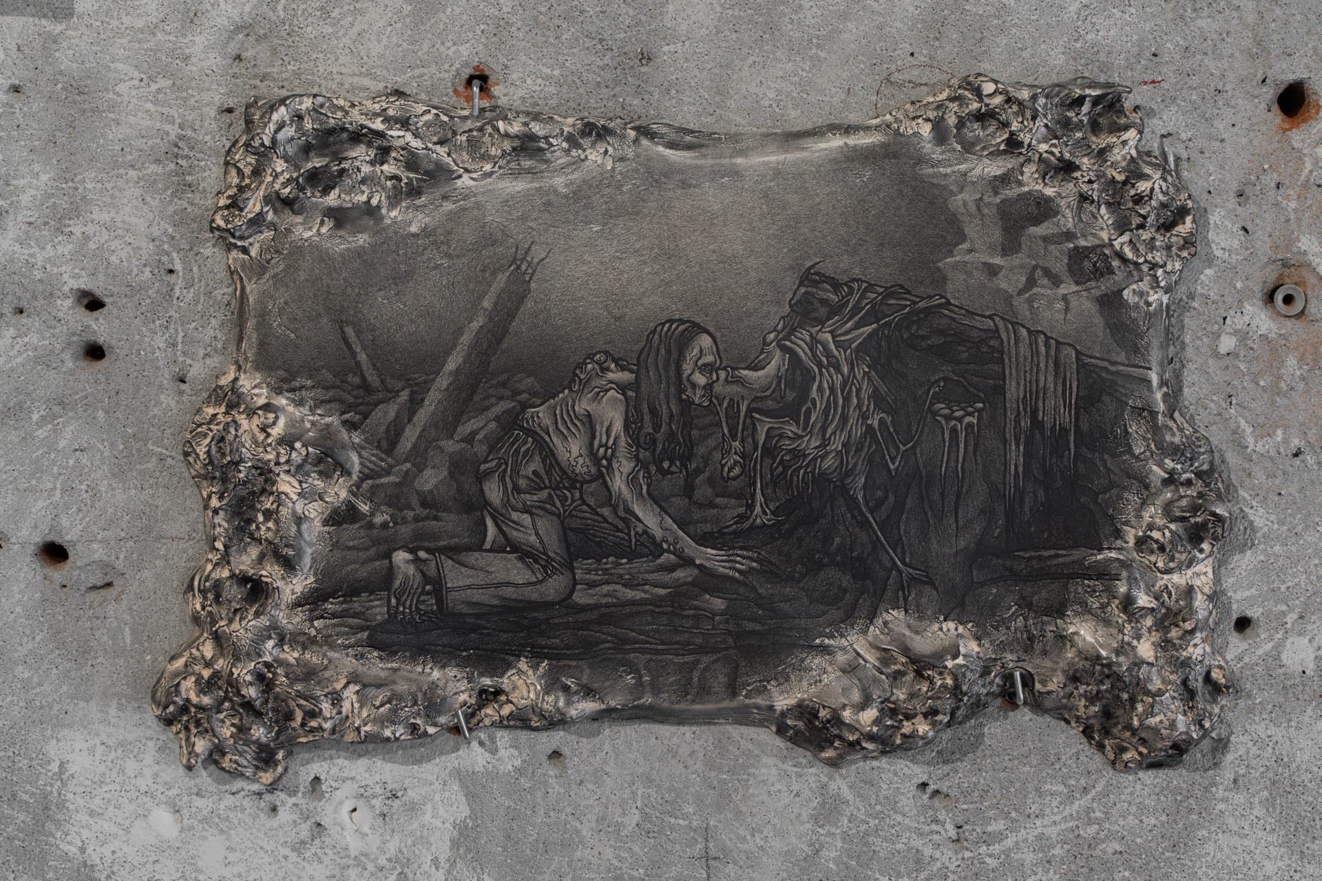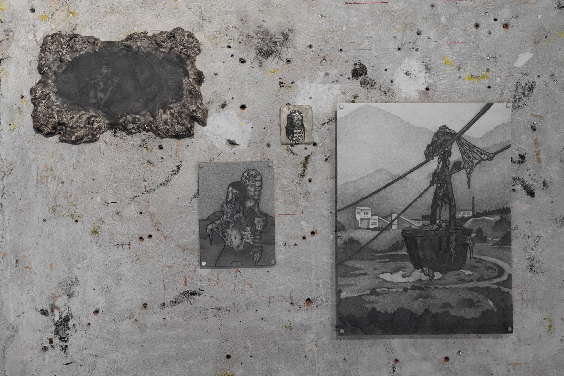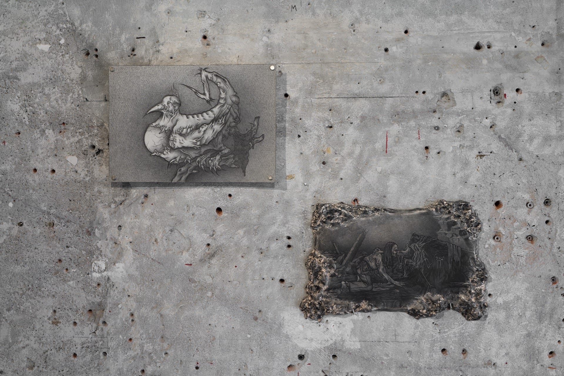 1. Injured, 2023, graphite on air-dry clay, 20.2x15.6cm 2. Rotting, 2023, graphite on paper, 25x18cm